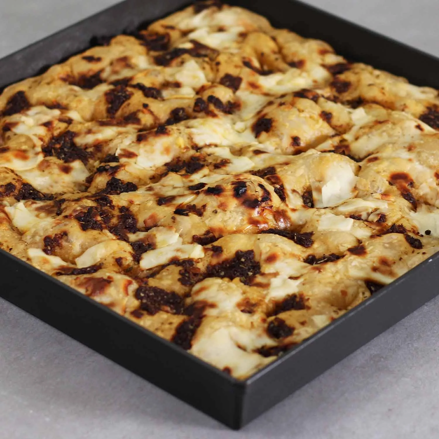 The predominant ingredient in the cooked topping mixture is dark balsamic vinegar. This sweetness balances the salty Pecorino Romano cheese also used to top the focaccia. Tomato paste and anchovy sauce build the savory flavor profile. The rosemary, oregano, and dried shallots also create flavor. These are sautéed in the classic extra virgin olive oil, which is typically placed on top of the focaccia.